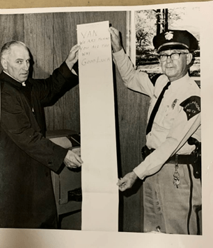 Below is a picture of Bergie, on the left, with the local policeman Jerry Caulkins. Best I can tell they are holding a petition of sorts wishing good luck to a local sports star Van Bronson, who was a standout high school athlete and later earned a football scholarship to the University of Nebraska. This picture was in the Evening Sentinel.